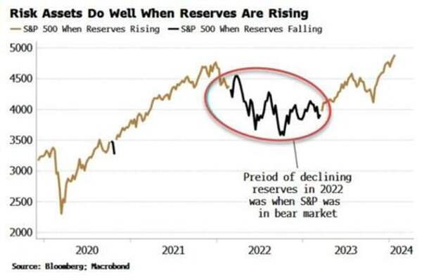 The effect is not merely theoretical. The period of poor S&P returns in the 2022 bear market were accompanied by a worsening trend in reserves, driven by, among other things, a high and generally rising TGA.