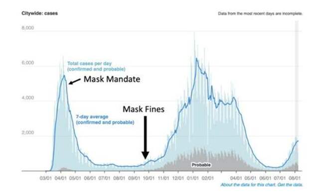 I looked at “cases” in places like New York City and pointed out when the mask mandate and fines were applied (Fig. 4). Notably, the NYC mandate was instituted after cases had already begun to fall, and coercive fines did not prevent the second wave, which was longer and reached a higher peak than the first wave.