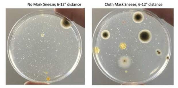 I had my allergy-prone daughter sneeze onto petri-plates with and without the CDC-approved masks we wore to enter locations that enforced the mask mandate (Fig. 5). The saliva spray patterns, illustrated by microbial growth on the plates, were virtually indistinguishable.