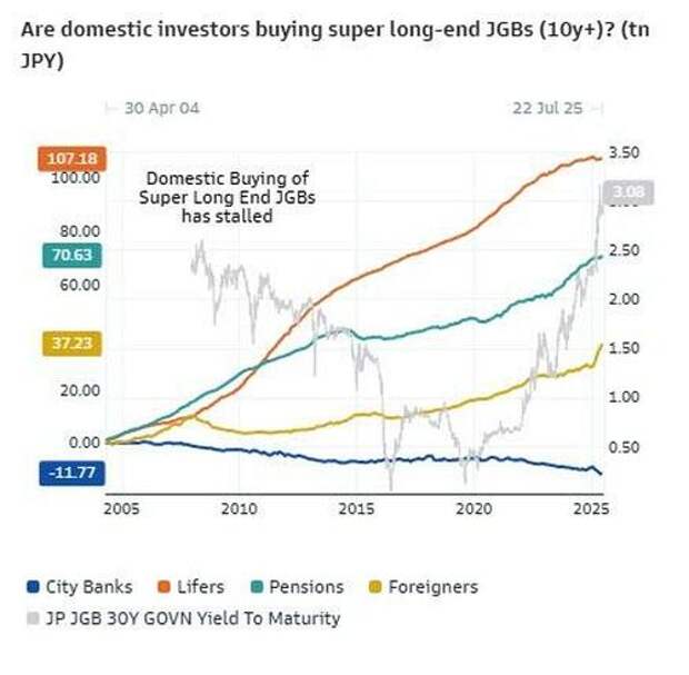 Goldman Japan rates strategist Sung Mo Koo highlights that "[a]s in Deputy Governor Uchida's press conference today, the agreement contributes to lower uncertainty in Japanese economy and higher likelihood of achieving the 2% inflation target. Market should find better demand at current level for up to 10y sector, whereas the ongoing fiscal concern due to political uncertainty is likely to drive back-end yields higher. Ultra-long end sector has been supported by foreigners in CY2025 as their net purchase amount skyrocketed by more than sevenfold year-to-date, but such trend is unlikely to continue long term."