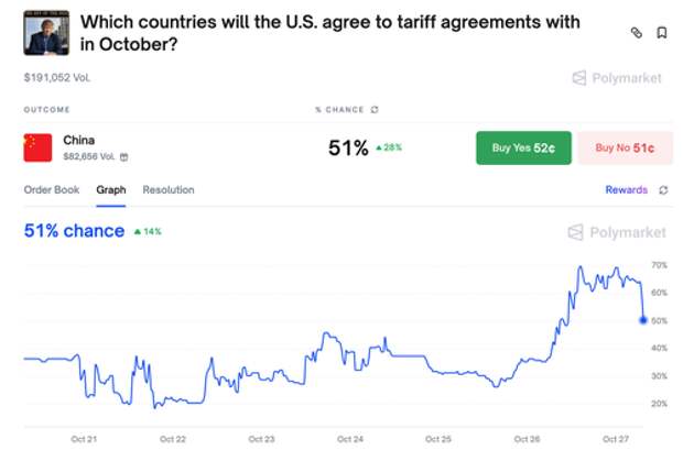 S. Treasury Secretary Scott Bessent revealed a "successful framework" after his meeting with top Chinese trade officials. All indications so far suggest the Trump-Xi meeting may produce a deal.Odds on the cryptocurrency-based prediction market Polymarket show a 51% chance that the U.S. and China will agree on a trade deal this month.
