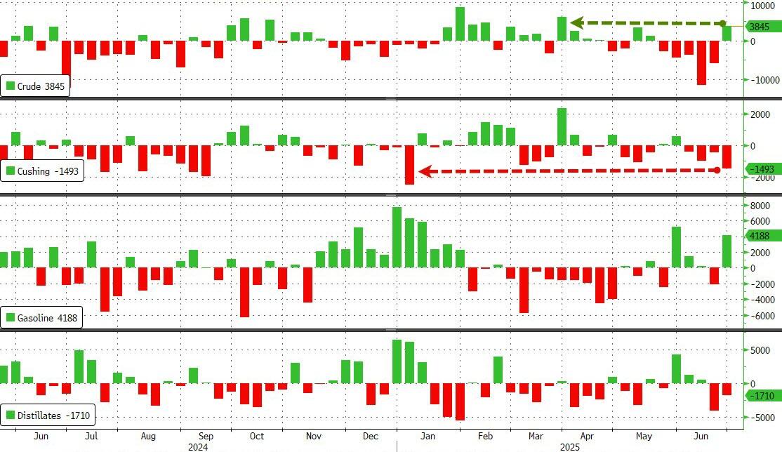 A big crude build (the first in six weeks and biggest since March) was offset by a relatively big drop in stocks at the all important Cushing Hub last week as gasoline inventories surged and distillates declined...