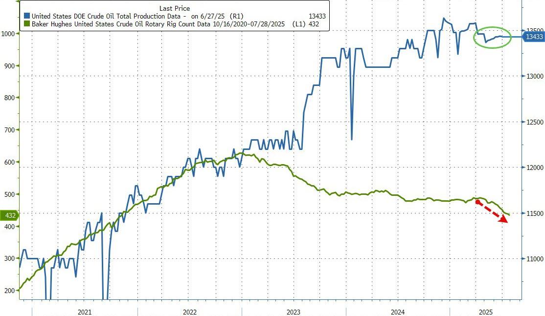 US Crude Production was basically flat at or near record highs despite the rig count continuing to decline.