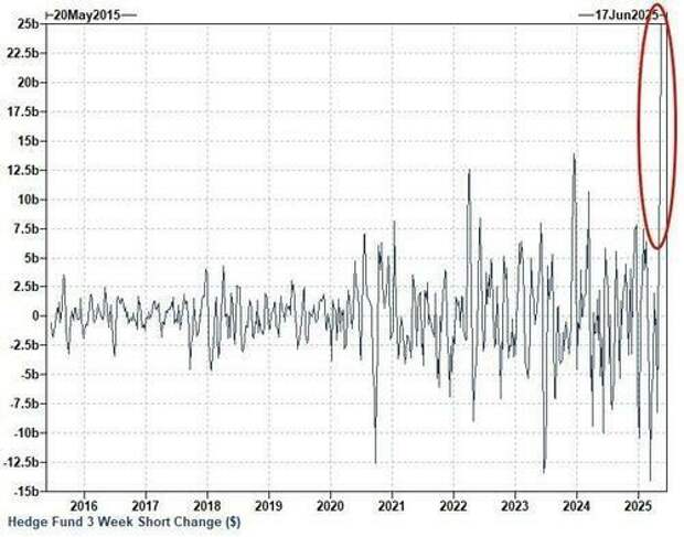 The data below confirms that view, with the recent stretch of Hedge Fund short selling remaining unprecedented and reflective of some skeptics. Over the past 3 COT reports, Hedge Fund shorts surged ~$25bn – the largest amount for at least the past 10 years.
