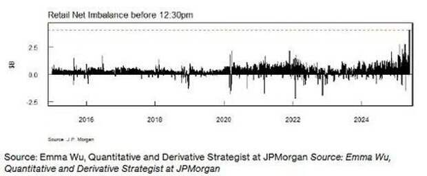 “Monday was a record-setting day. Stocks opened down 1% on news that Moody’s downgraded the US credit rating to AA. While some perceived the downgrade as problematic, retail investors, aka individuals, bought stocks at the highest rate ever. Per JP Morgan, retail investors purchased a net of $4.1 billion of US stocks in the first three hours of trading. As their graph below shows, Monday’s retail buying stampede dwarfs prior instances”