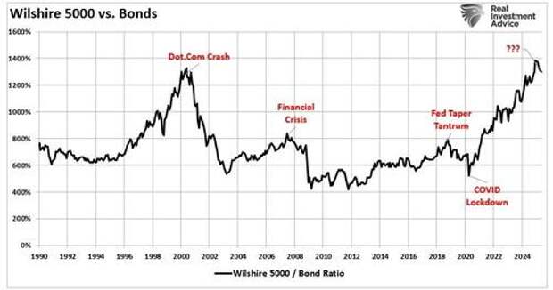 The bullish bias is evident in the long-term relationship between stocks and bonds. The ratio of stocks to bonds has far exceeded that of the “Financial Crisis,” and is now on par with the “Dot.com” bubble peak, with a similar sharp slope higher.