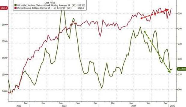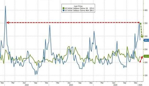 After exploding to its highest since Jan 2022, unadjusted jobless claims crashed lower last week while 'seasonally-adjusted' initial jobless claims rose to 223k (its highest since the first week of December)...
