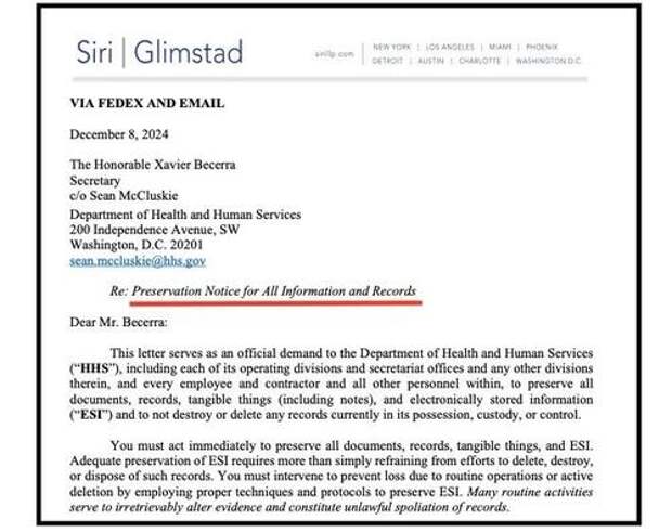 Siri issued a legal notice to the FDA and other agencies within the Department of Health and Human Services, warning against the destruction, deletion, or modification of any relevant documents and vowing to report any such violations to the Department of Justice.