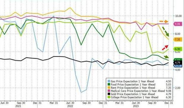 2% from 3.1% in November, while core inflation dips to 3.8% from 4.0% YoY.The pullback in consumers’ near-term inflation views reflected a number of factors, but most notably a pullback in the expected price changes for food and rent. The cost of college is anticipated to climb at a faster rate, while forecasts for gasoline prices and medical care stabilized: as shown in the next chart, the expected price changes for the cost of a college education increased by 0.5 percentage points to 6.3%, decreased by 0.3 percentage point for food to 5.0%, decreased by 0.7 percentage point for rent to 7.3%, and remained flat for gas at 4.5% and the cost of medical care at 9.1%.