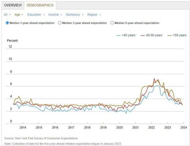 Amusingly, inflation views among those over age 60 retreated to a fresh three-year low, while every age group was also at or near a multi-year low. One almost wonders just who are these people the NY fed "randomly" calls up to "survey."