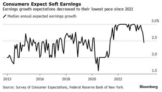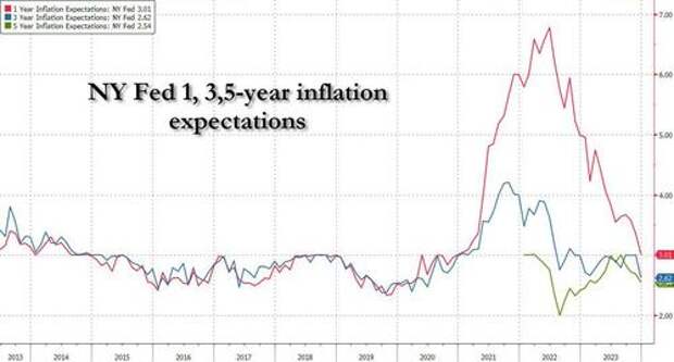 The bigger problem for the Fed is that while overall inflation expectations dipped, it wasn't for good reasons; indeed, the expected year-ahead earnings growth fell to the lowest level since April 2021 as median expected growth in household income decreased by 0.1 percentage point to 3.0%. The decline was driven by respondents with a high school diploma or less, the New York Fed said. People earning less than $50,000 expect 1% income growth, while those earning $100,000 or more expect 3%. The series has been moving within a narrow range of 2.9% to 3.3% since January 2023.