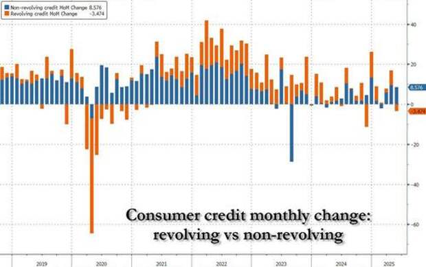 1 billion, half of the $10.55 billion expected, it was all on the back of non-revolving credit (i.e., student and car loans). That's because revolving (or credit card) debt slumped by $3.5 billion, the first drop in 2025, and the second biggest monthly decline since covid.Starting with nonrevolving credit, the monthly change remained sturdy, with the total rising to a new record high of $3.749 trillion...