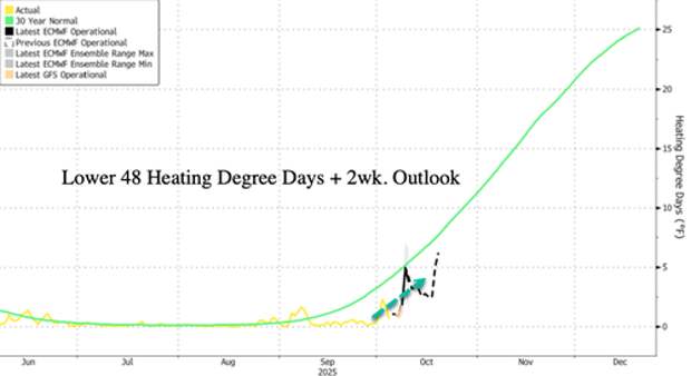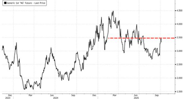 A team of Goldman analysts led by Samantha Dart, senior energy strategist, explained that the jump in NatGas prices last week to nearly $3.5/mmBtu was largely due to the roll into the November "winter" contract, which carries stronger heating demand and lower storage congestion risk.