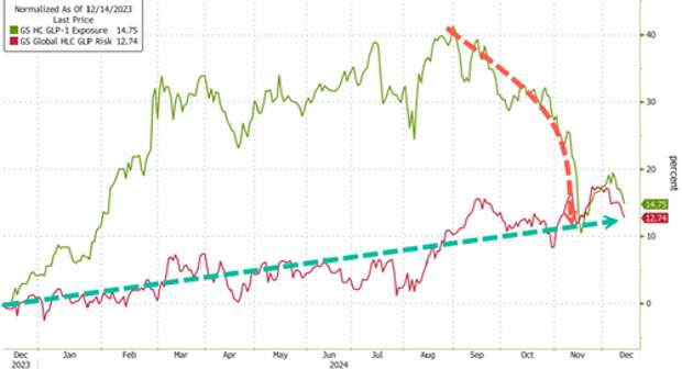 Using Goldman's index of companies with high exposure to GLP-1s, the Trump dump pressured the index lower from nearly 40% gains on the year in late summer to hovering around 14% on Friday, while companies at risk from GLP-1s have steadily gained on the year, 13%.