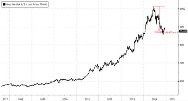 In Copenhagen, Novo shares slid as much as 5.4%. Since peaking in June at 1,000 Krone, shares have entered a bear market (-26%).