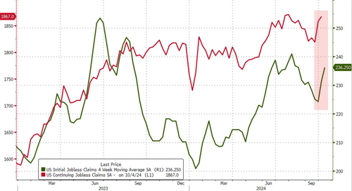 After last week's storm- and strike-driven surge in initial jobless claims, the headline data slipped back from 260k (revised higher) to 241k...
