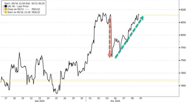 Despite the turmoil, French 10-year yields fell five basis points to 3.51% on today's news, while the CAC 40 has nearly erased its losses from earlier in the week.