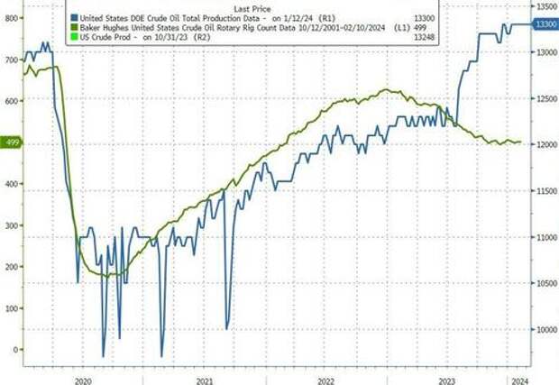 US Crude production remained at a record high 13.3mm b/d, despite the ongoing trend lower in rig count...