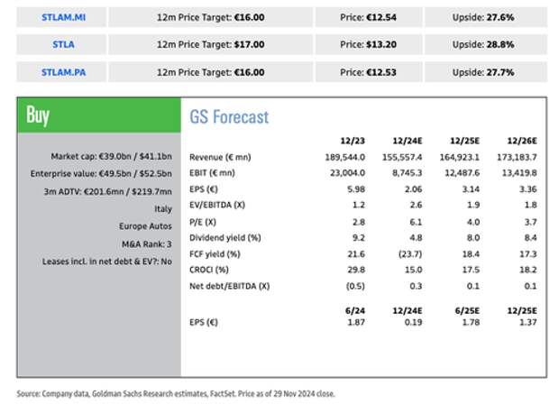 Galliers reaffirmed a "Buy" rating on Stellantis shares trading in Europe, noting, "We apply a P/E target multiple of 5.0x to our 2025 EPS to derive a 12-month price target of €16/$17."
