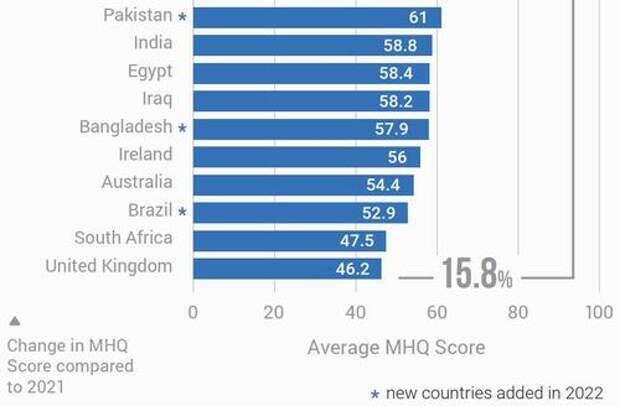 In a recent viral tweet, the commentator James Melville posted some figures showing that Britain is the most miserable country in the world. Specifically, Britain was ranked last out of 64 countries on average ‘Mental Health Quotient’ score in the year 2022.