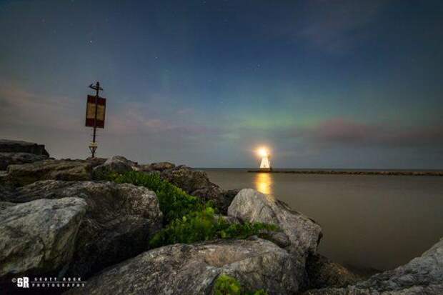 Full moon G3 Aurora captured over the Range Lighthouse where the #SaugeenRiver meets LakeHuron in Southampton Ontario Canada August 26, 2018 (Source/ @scottrockphoto)