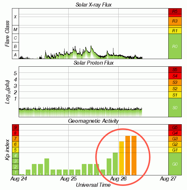 The K-index, a chart that measures the earth’s magnetic field with an integer in the range 0–9 with 1 being calm and 5 or more indicating a geomagnetic storm, hit the 4 threshold was reached at 21:43 UTC on August 25, followed by K-index of 5 (G1 Minor) at 01:54 UTC on August 26, K-index of 6 (G2 Moderate) at 02:57 and K-index of 7 (G3 Strong) at 05:59 and 07:38 UTC.