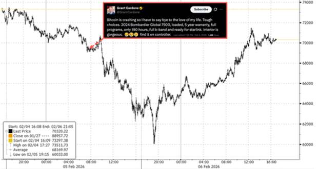 Minutes after Bitcoin plunged below the $70,000 handle on Thursday evening, Grant Cardone of Cardone Capital told followers on X that, with "Bitcoin crashing," he now has to sell his $75 million private jet.