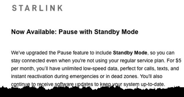 Starlink has introduced a new $5-per-month "Standby Mode," giving customers unlimited low-speed data for calls, texts, and instant reactivation during emergencies or in dead zones, according to a new company email.