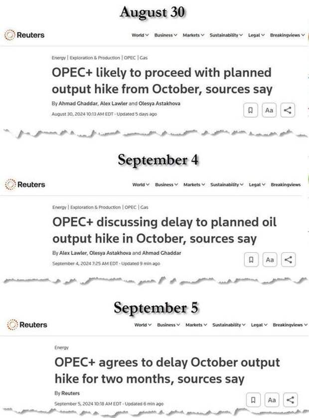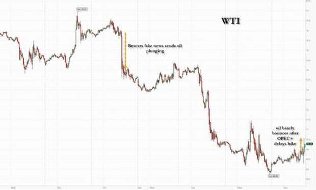 "We didn't have long to wait for the denial, and as we reported yesterday, ironically enough it was Reuters who reported that contrary to its own so-called "reporting" just days earlier, OPEC+ would actually delay the planned oil hike, much to the shock and horror of anyone who actually believed Reuters and saw it as an objective news source instead of a conflicted, manipulative potentially criminal generator of price volatility with its own bullshit reporting.