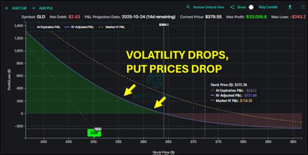 If a trader bought puts during the frothy GLD rally, they could actually see their position lose value despite a major drop in the underlying asset.