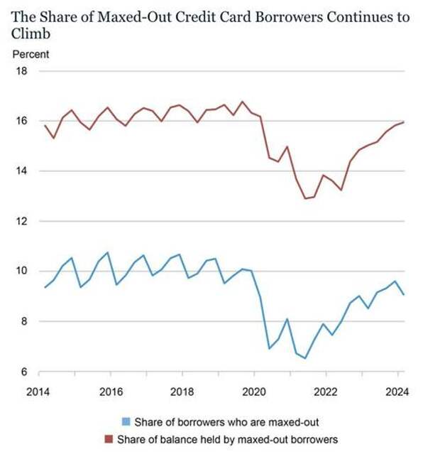 Per the NY Fed, in 2024, more people are maxing out their credit cards compared to 2023. The New York Fed’s latest report shows household debt increased by $184 billion in the first quarter of 2024, with credit card balances dropping by $14 billion, typical for the period. However, credit card delinquency is rising, with 18% of borrowers using at least 90% of their credit limit, indicating a higher rate of maxed-out cards.