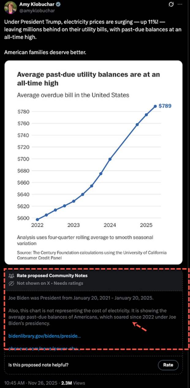 Instead, her office's social media team attempted, one day before Thanksgiving, to launch a propaganda campaign on affordability on X that backfired spectacularly, culminating in a humiliating Community Note that exposed her sheer cluelessness.Klobuchar's X post attempted to blame the entire power bill crisis on President Trump, with a graphic showing a parabolic line rising to the right that would alarm anyone.
