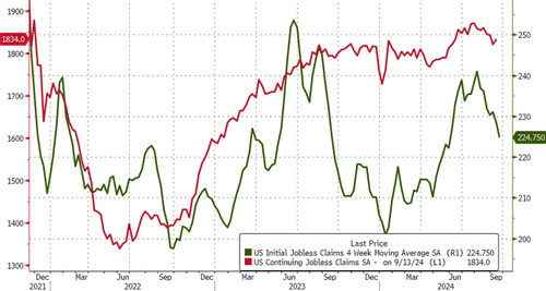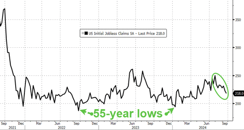 Just a week after The Fed slashed rates by a crisis-like 50bps, initial jobless claims tumbled back towards multi-decade lows (217k)...