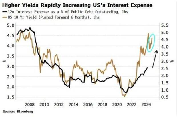 The 10-year yield gives us a near real-time barometer for the US’s annual interest expense. The recent rise in yields projects the expense will soon double to almost 5% of total debt outstanding, or over $1.7 trillion - i.e. about the GDP of Australia each year in interest.