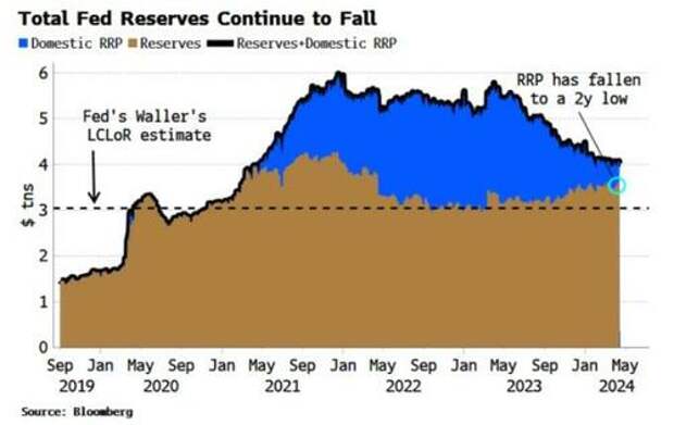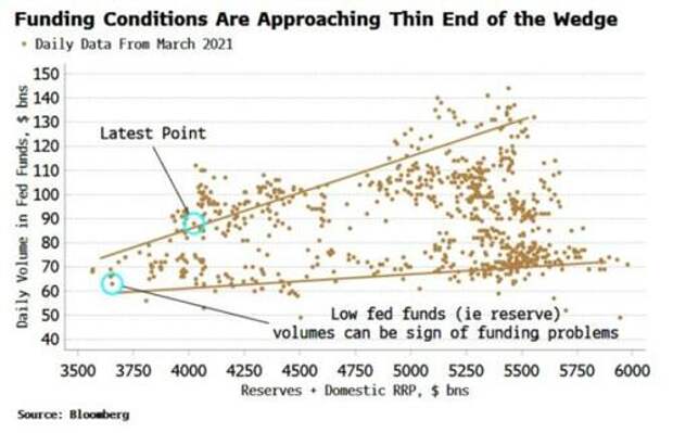 But the RRP falling and eventually going to zero is a harbinger total reserves overall are potentially nearing their so-called lowest comfortable level — with estimates for the LCLoR ranging from about $2.5 to $3 trillion — where abrupt and acute funding problems become more likely. This week the domestic RRP fell as low as $327 billion, and is now at $440 billion, the lowest levels it has reached since June 2021, taking the sum of reserves and the RRP to just over $4 trillion.