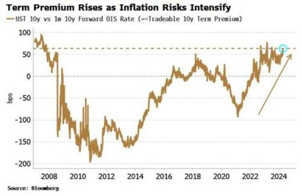 The curve has been bear steepening in the 3-12 month versus 10-year sectors as inflation fears drive term premium higher, with the measure now close to levels last seen in 2008 (using tradeable forward OIS rates rather than “academic” term premium).