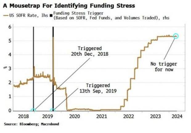 The signal is inactive at the moment and the SOFR rate is currently well-behaved, but that can change quickly. In the last two major funding flare ups in 2018 and 2019, there were very few signs of what was to come, with the signal triggering only a few days before rates started to spike higher.