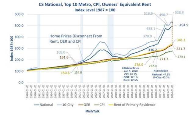 Case-Shiller national and 10-city indexes via St. Louis Fed, OER, CPI, and Rent from the BLS