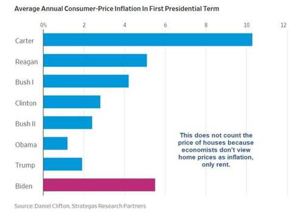 The U.S. economy is great, Bidenomics is the reason, and don’t worry, be happy. Yet the voters, those numbskulls, keep telling pollsters they don’t feel the boom and they don’t approve of President Biden’s economic performance.If our friends on the left want to stop berating voters and admit reality, they might look at the chart nearby from Dan Clifton of Strategas Research Partners. It compares the average annual consumer-price inflation rate across the first term of the last eight presidencies. As you can see, Mr. Biden’s average inflation rate of 5.5% is second only to Jimmy Carter’s average rate of 10.3%, and Mr. Carter wasn’t re-elected.