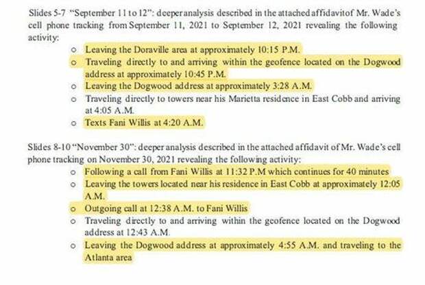 Trump’s attorneys were able to obtain, by subpoena to AT&T, Wade’s cell phone records from 1/1/2021 through 11/30/2021. Wade’s location data was analyzed by an investigator hired by the attorneys - an analytical tool which generated geolocation data that pinpointed Wade’s presence at DA Willis’s South Fulton Condo during that time period.