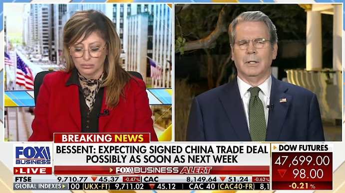 Watch Bessent on Fox: U.S.-China Trade Deal expected to be Signed as Early as Next Week