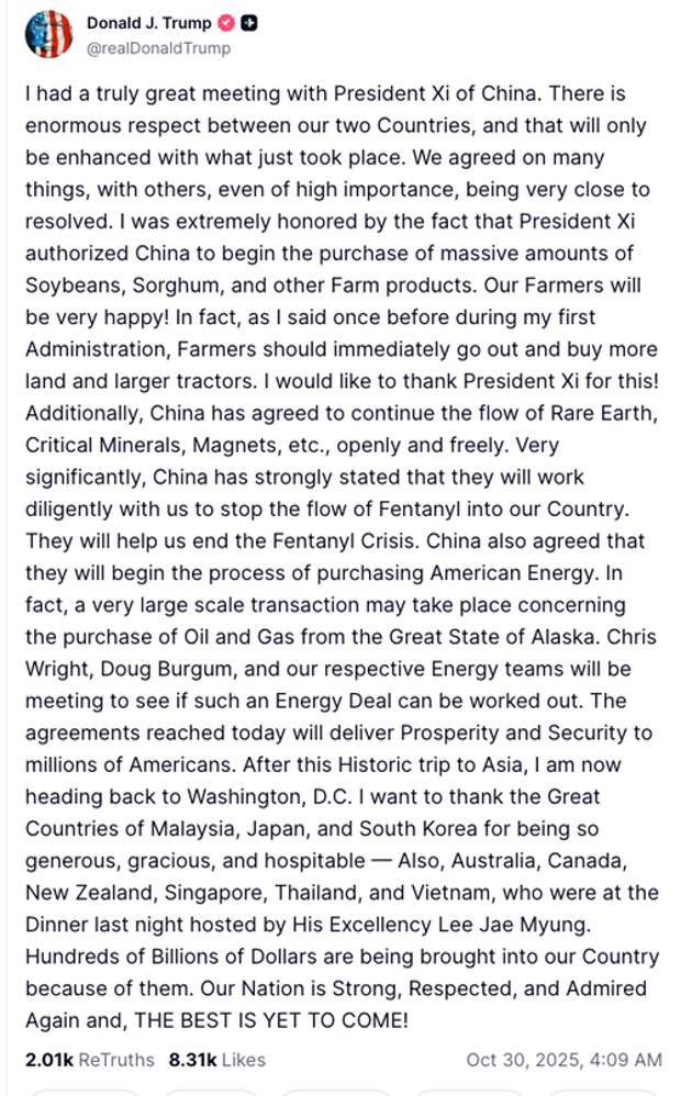 Trump said he had an "amazing meeting" with Xi and would immediately slash China's fentanyl tariffs to 10%. He added that China would resume soybean purchases from American farmers. In other positive developments, Beijing agreed to suspend rare-earths export controls for one year, while Washington would dial back blacklisting subsidiaries linked to Chinese firms. Also, both sides agreed to remove certain shipping tariffs and fees.