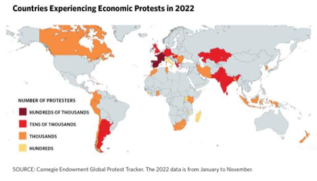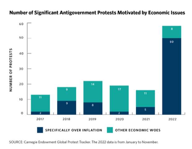 What's alarming so far this year is the tick-up in global protests, adding to the momentum from last year. Data from the Carnegie Endowment's Global Protest Tracker shows a disturbing trend as inflation and economic woes spark worldwide protests.