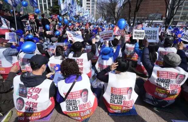 Protesters wearing vests bearing the image of South Korean President Yoon Suk-yeol attend a rally on Saturday, 18 March 2023, in the South Korean capital, Seoul, to demonstrate against a summit between South Korea and Japan. Japanese Prime Minister Fumio Kishida on Friday praised Yoon for "making a difficult decision and action" by overcoming the troubled history between the two countries, pledging to work with him for better relations in the future.
