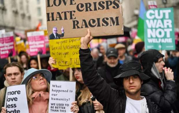 Protesters hold up placards as they participate in the Resist Racism March and Rally in central London on 18 March 2023, ahead of the United Nations anti-racism day on 21 March.