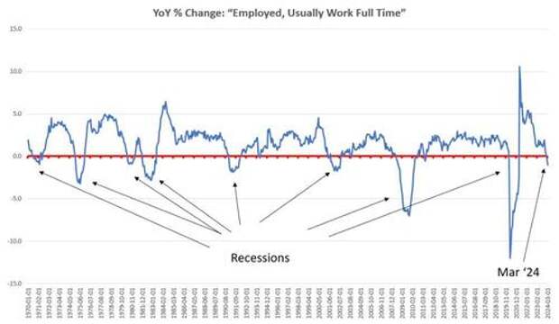 Turns out that, historically speaking over the last 50 years, two (or more) consecutive months of declining full-time jobs means recession is either imminent or already underway.