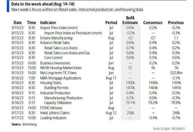 Finally, turning to just the US, Goldman writes that the key economic data releases this week are the retail sales report on Tuesday and the Philadelphia Fed manufacturing index on Thursday. The minutes from the July FOMC meeting will be released on Wednesday, and Minneapolis Fed President Kashkari has a speaking engagement on Tuesday.