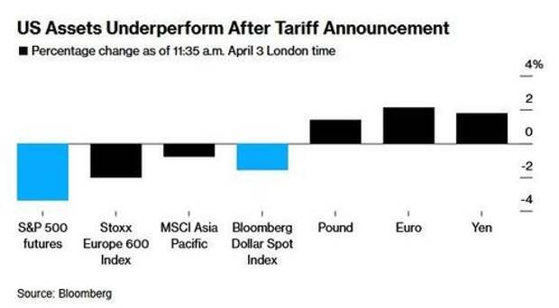 While the jury is still out on the final outcome of Trump's "reign of tariffs", which came in far more sever than expected, one thing is emerging: for now, Trump's shake-up of the global trading system is hurting US assets more than those in many of the big economies he has just slapped with additional tariffs. As noted above, US index futures tumbled as much as 4% after and the dollar cratered, while the impact elsewhere was less extreme. The Stoxx Europe 600 was down 1.9% and a broad gauge of Asian stocks fell as much as 1.7%; while the euro was up 2.2% against the dollar, hitting its highest level since October in what was its biggest one-day jump in a decade. The yen likewise soared.