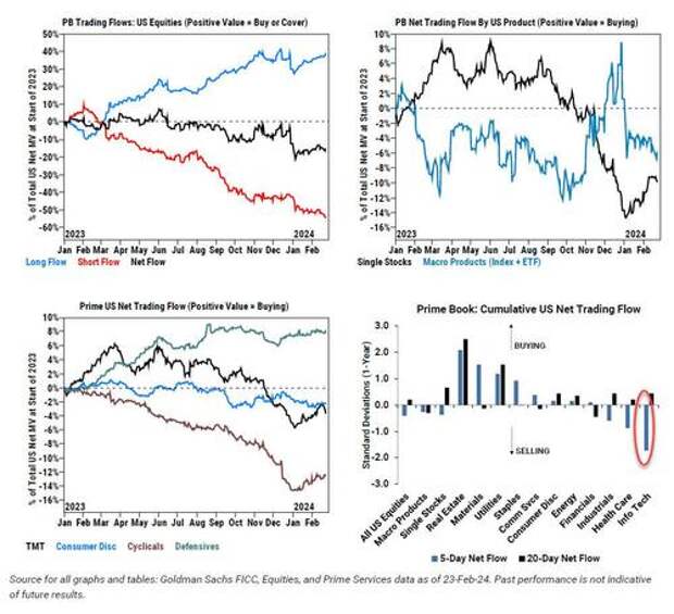 - Last week US equities saw the largest net selling in 5 weeks, driven by Macro Products as well as Single Stocks. Net flows point to rotation out of Tech, HC, and Industrials, while all other sectors were net bought. After a 6-week buying streak, HFs unloaded Tech stocks at the fastest pace in 7+ months, as the sector was net sold for 4 straight sessions incl. Thurs post NVDA results. GSPB