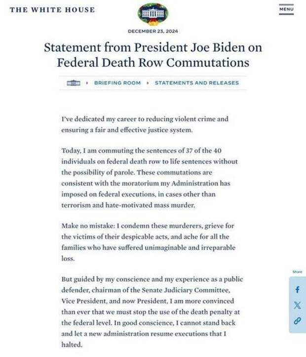 President Joe Biden on Monday announced that he is commuting the sentences of 37 out of 40 prisoners currently sitting on the federal government's death row - which will reclassify their sentences to life without the possibility of parole.